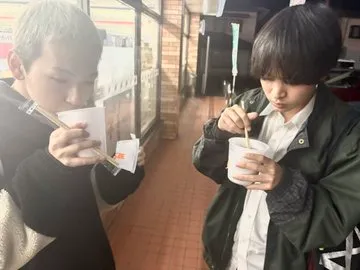 これは稽古中のご飯で食べたチキン南蛮と、稽古後におでん食べる後輩2人🍢
